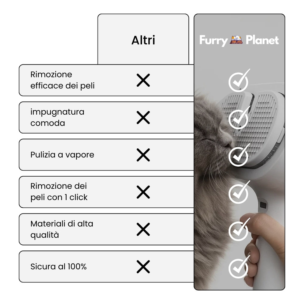 La spazzola rimuove facilmente i peli morti, igienizza il pelo con il vapore, riduce i nodi e mantiene la casa pulita senza stressare l’animale.